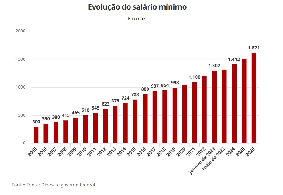 Ao ser aplicada, então, considera a inflação em doze meses até novembro deste ano (4,18%) mais 2,5% de alta real (PIB de 2024, limitado a 2,5%), elevando o salário mínimo para R$ 1.621 em 2026.